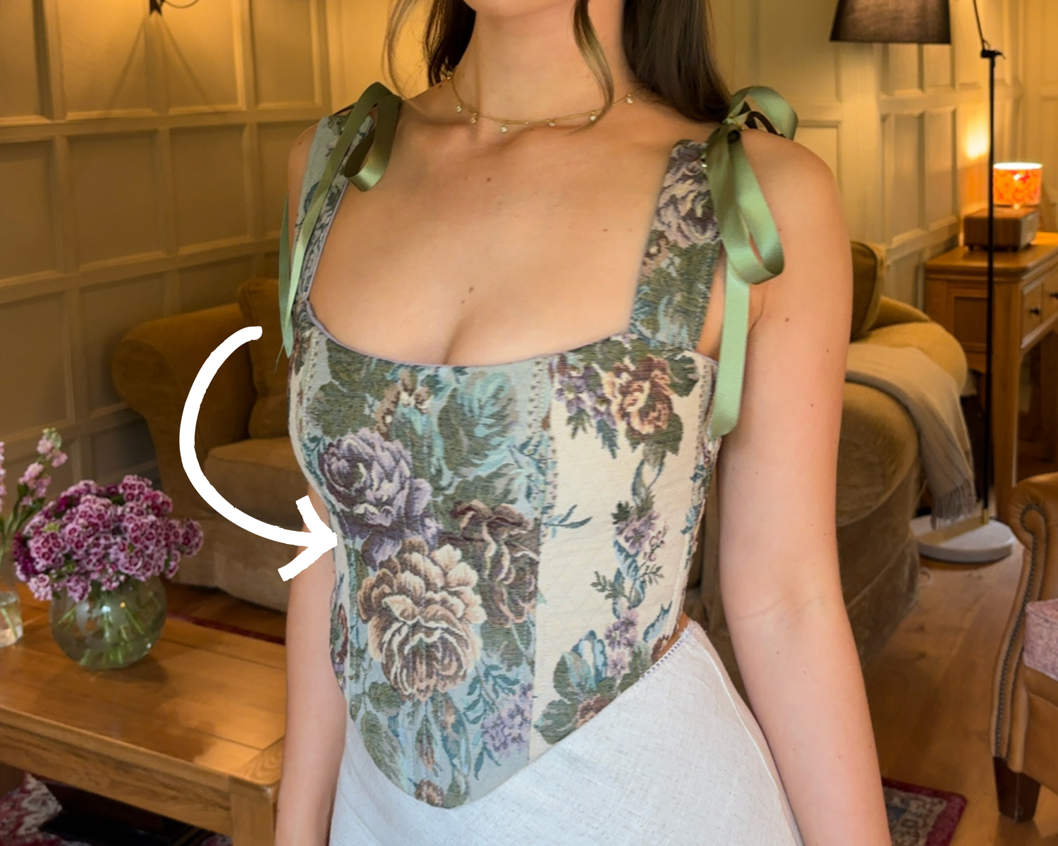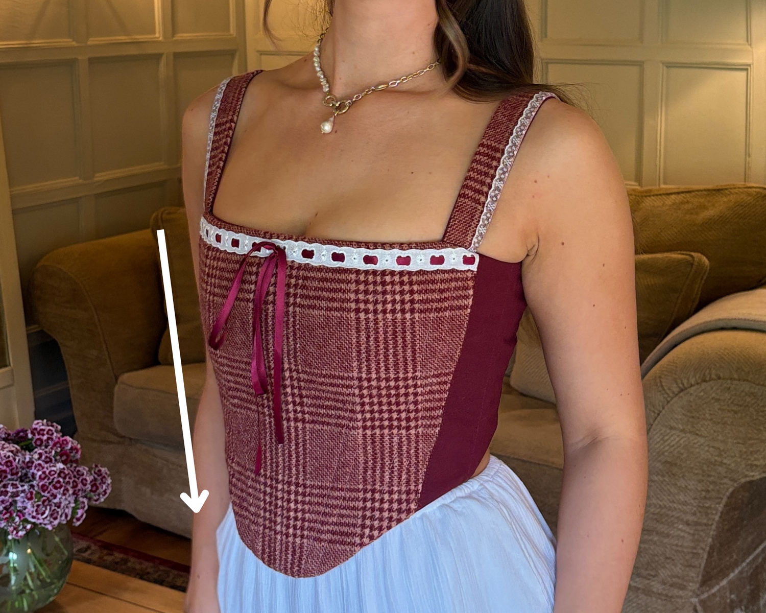 Please note image shows a curved bust corset, arrow is for visual purposes.