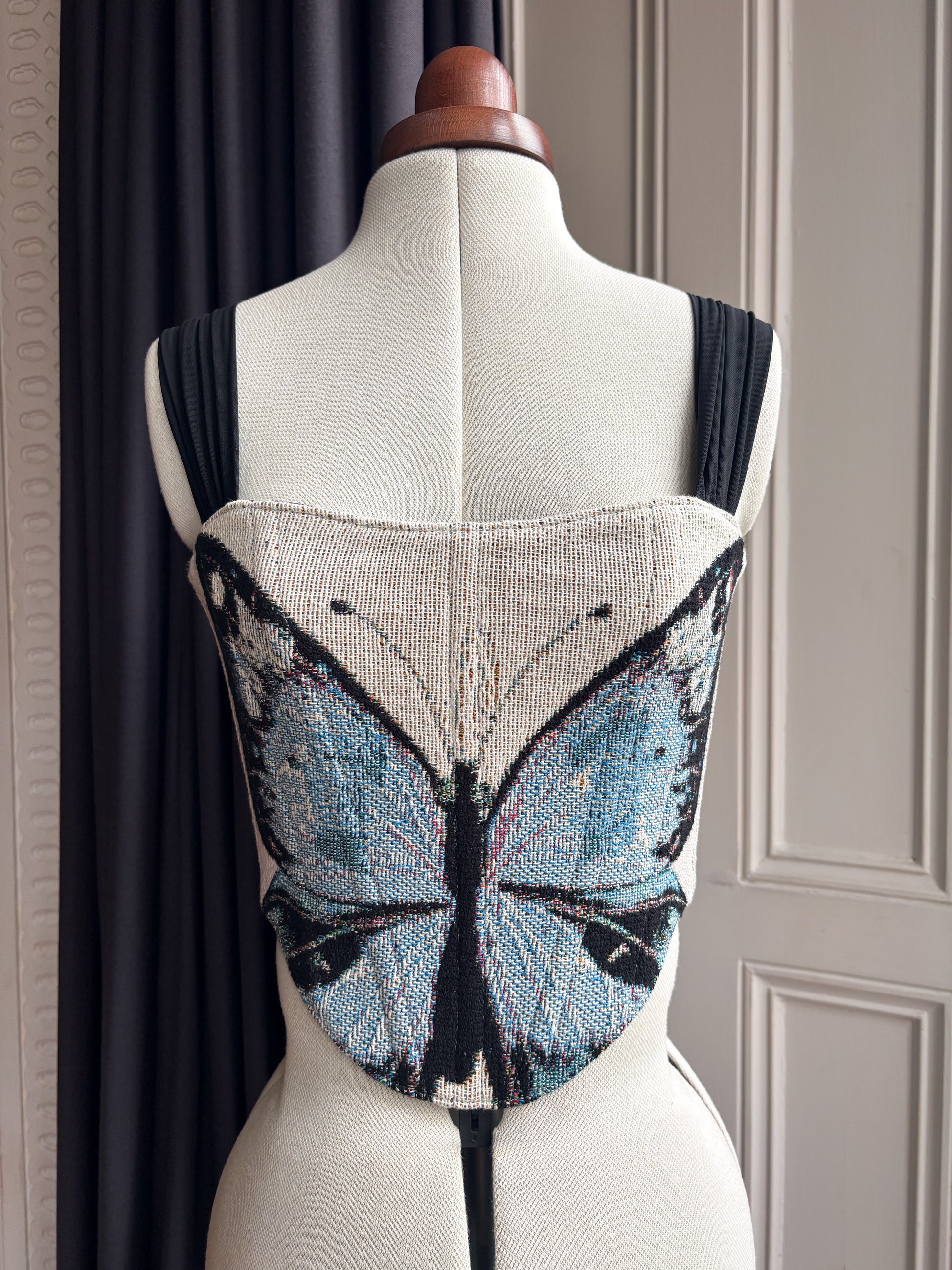The Blue Butterfly Corset features a striking butterfly silhouette on a textured neutral base. The mesh straps can be worn multiple ways, including off the shoulder or tucked in for a strapless look.