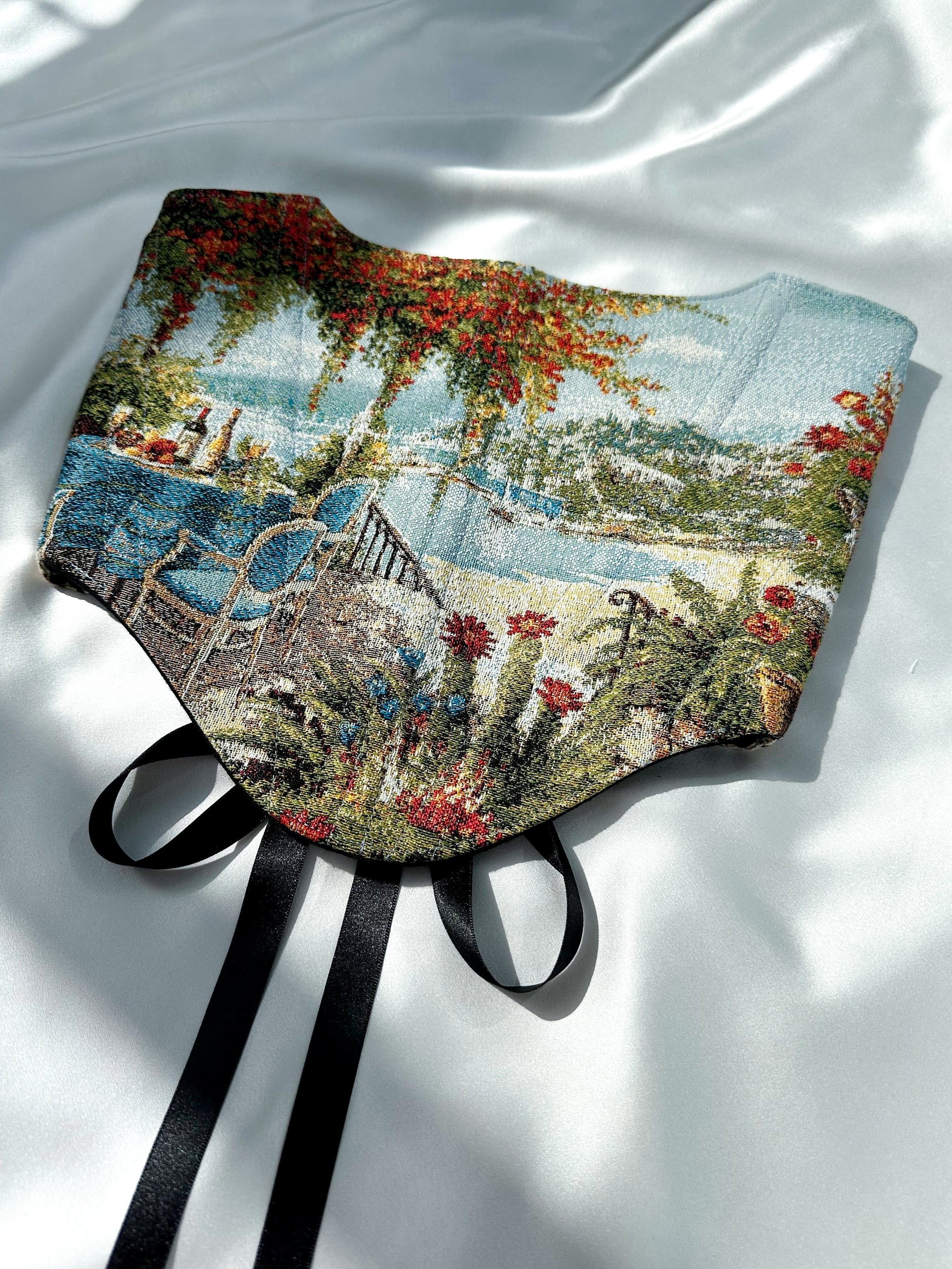 The Amalfi Dream Corset captures the romance of Italy’s southern coast. The front opens onto a sunlit terrace draped in cascades of red flowers, with blue chairs set for an alfresco moment overlooking the glittering sea. The back features a stunning vintage floral design to complete the look along with a sleek black lace-up ribbon.