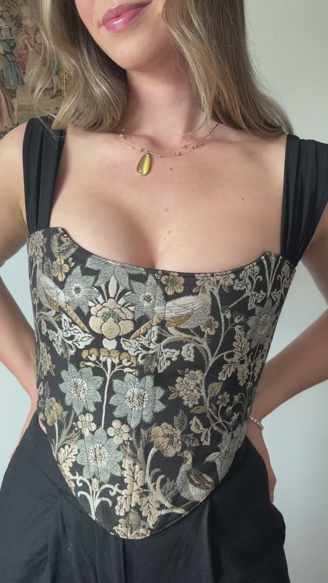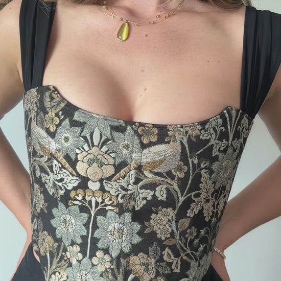 Intricate foliage and elegant birds in silver and bronze bring depth and detail to the striking ‘Thistlewing’ corset. Crafted in a timeless silhouette with modern detailing, designed to be worn as both statement and staple. This corset can be tailored to your preference, available with or without straps.