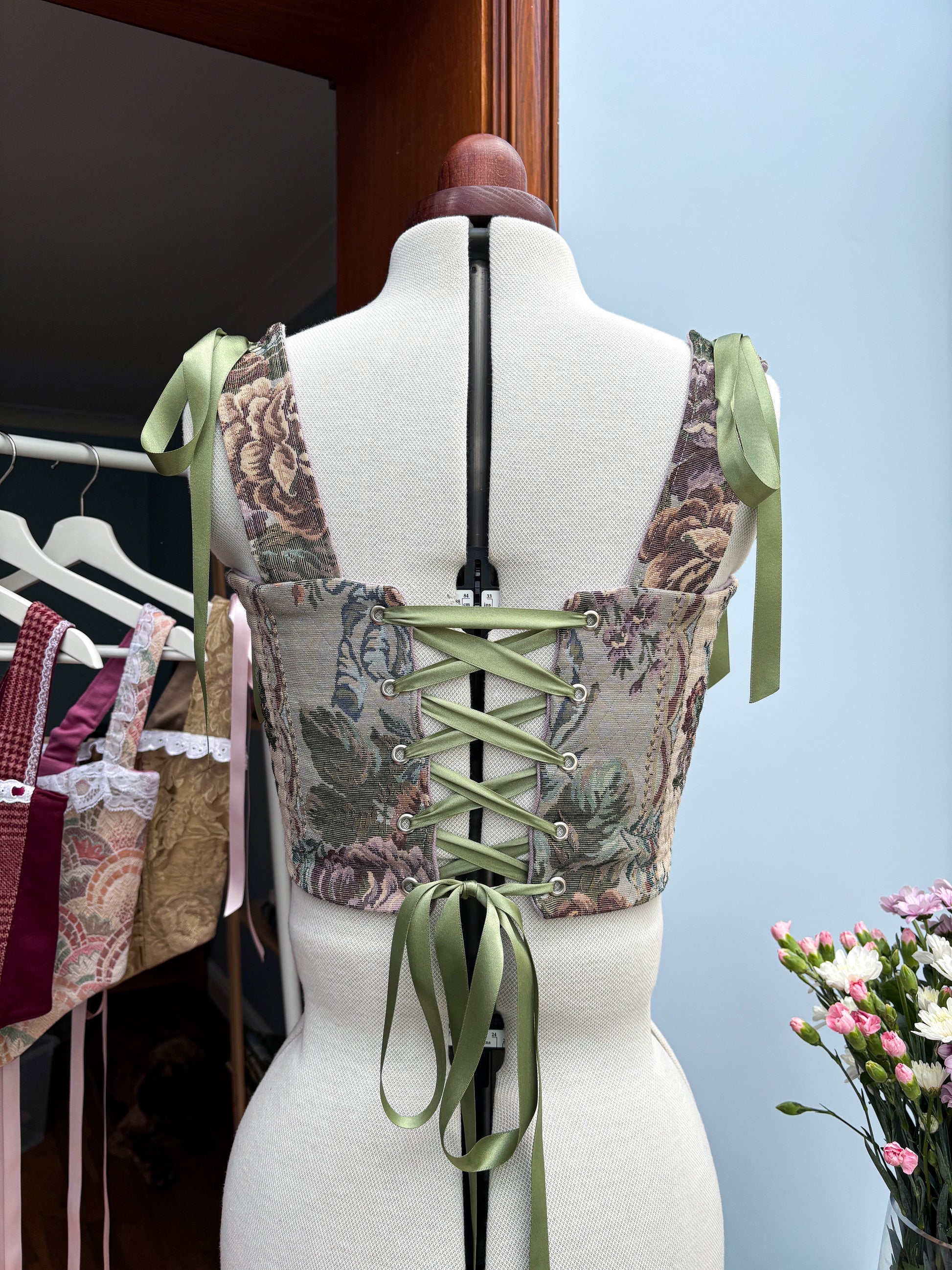 Introducing the ‘Blooming Bliss' corset, a floral design with climbing roses on a trellis background. Accentuated by a silky sage green ribbon and a scooped neckline, it radiates timeless elegance. This corset can be tailored to your preference, available with or without straps.