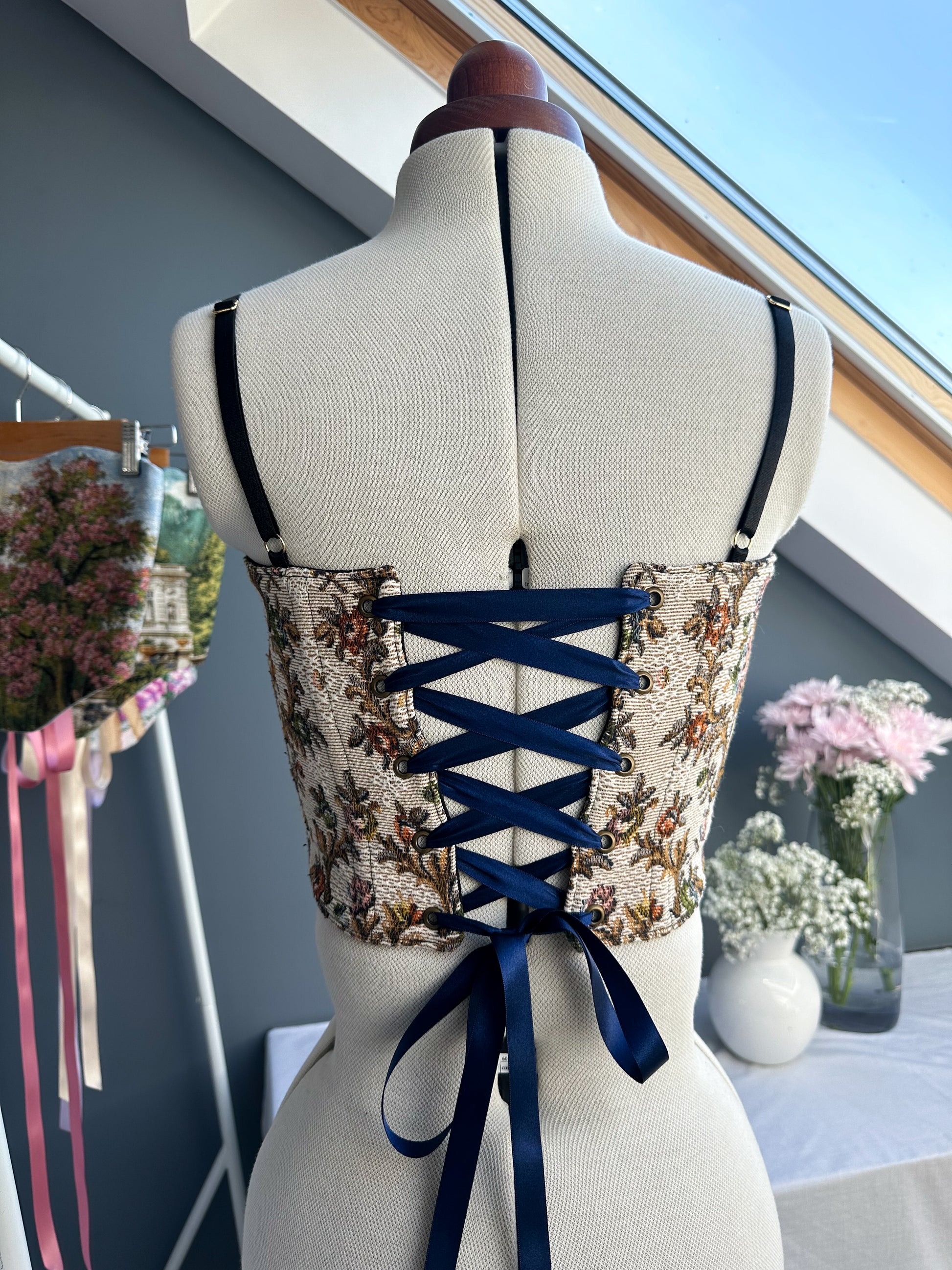The Butterfly Whisper corset is a captivating blend of classic elegance and vibrant beauty. Featuring a striking statement butterfly in an array of beautiful colours, this corset stands out against a timeless beige background, allowing the butterflies to truly pop. Ballet straps and a complementary floral fabric enhance the design, while a navy ribbon provides a refined finishing touch.
