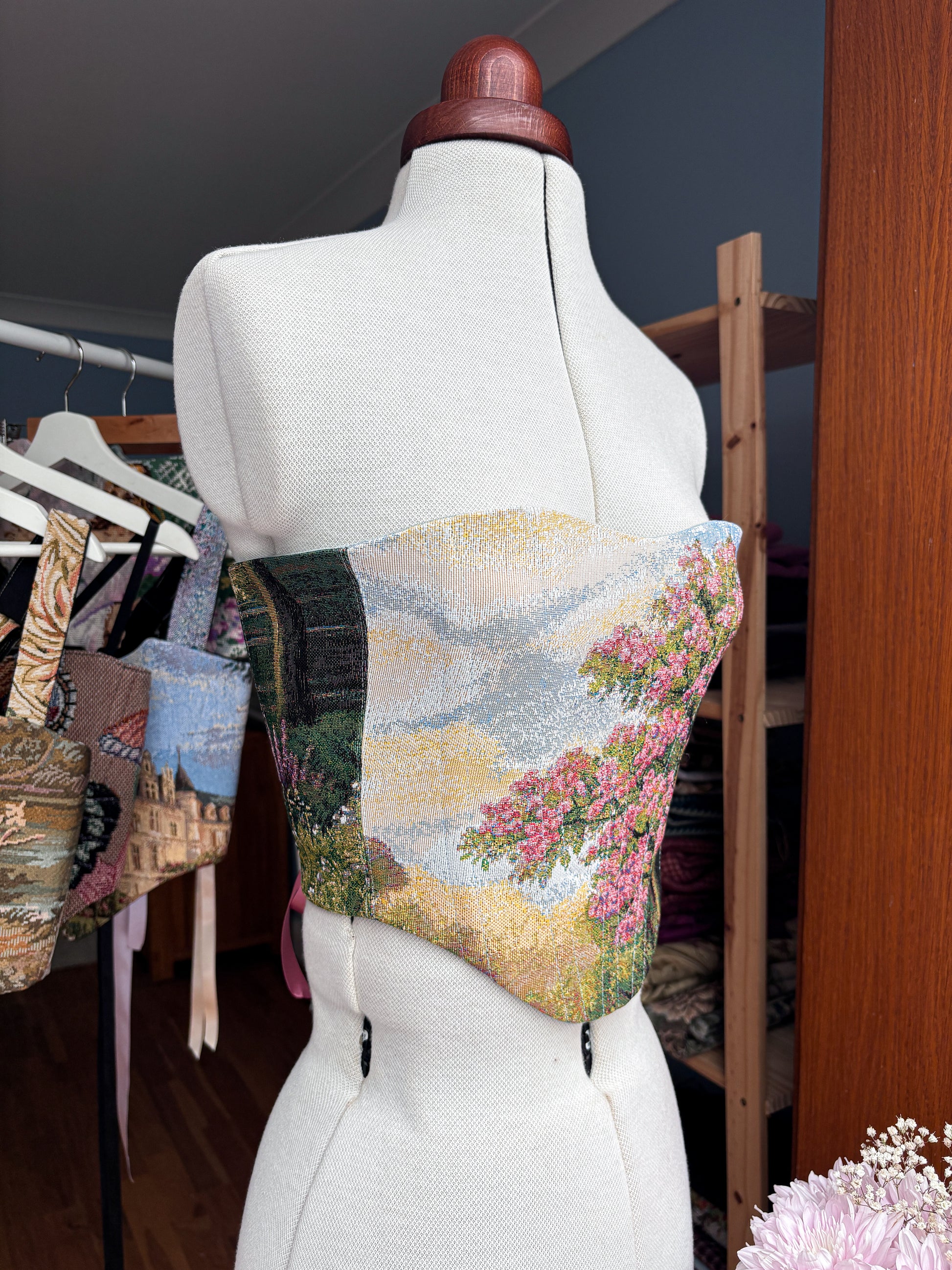 Introducing the Cherry Blossom Corset. Adorned with a striking blossom tree set against an abstract sky and meadow, it evokes the tranquil beauty of nature. The reverse reveals a serene floral meadow, all elegantly completed with a soft pink ribbon.