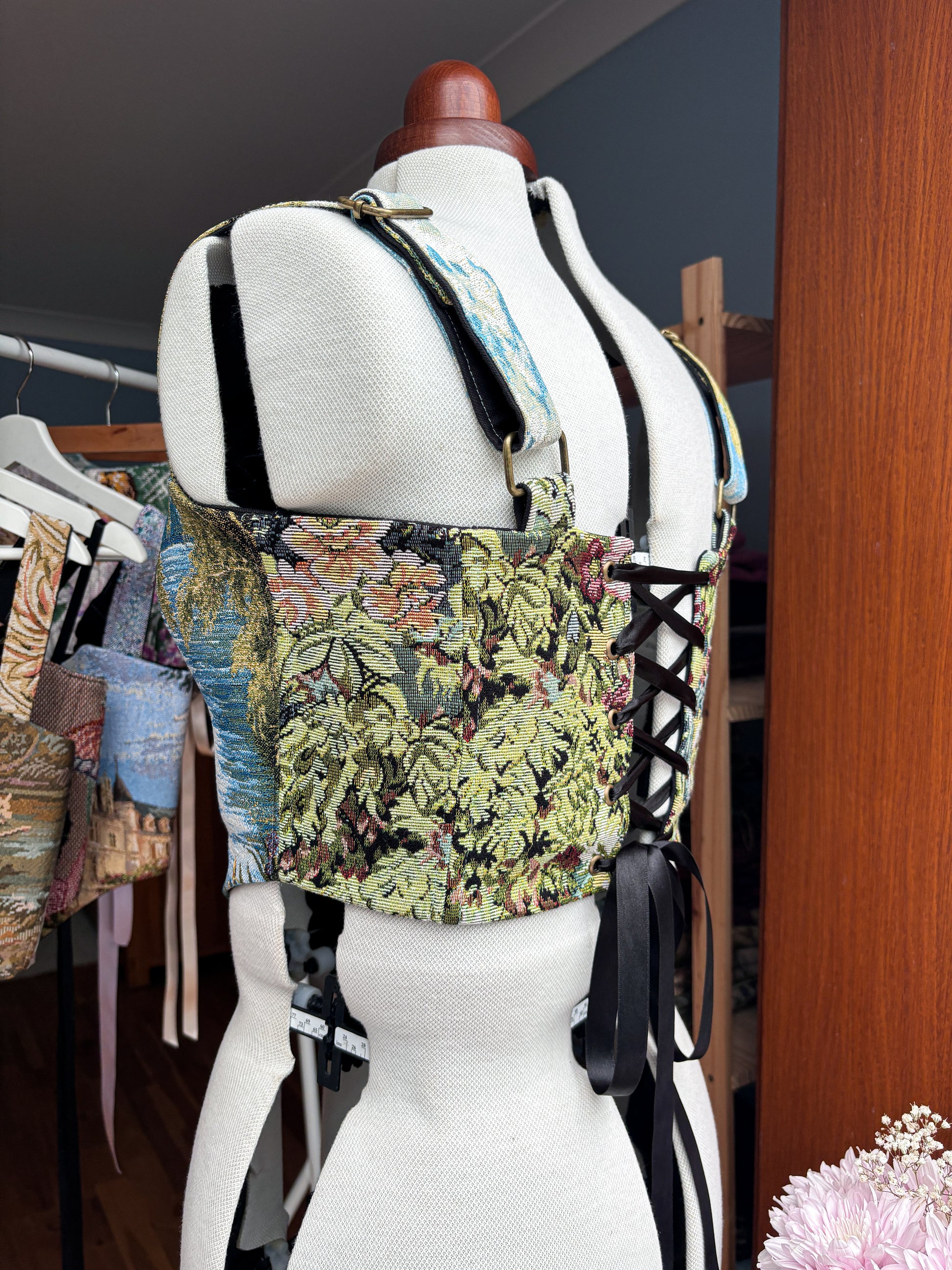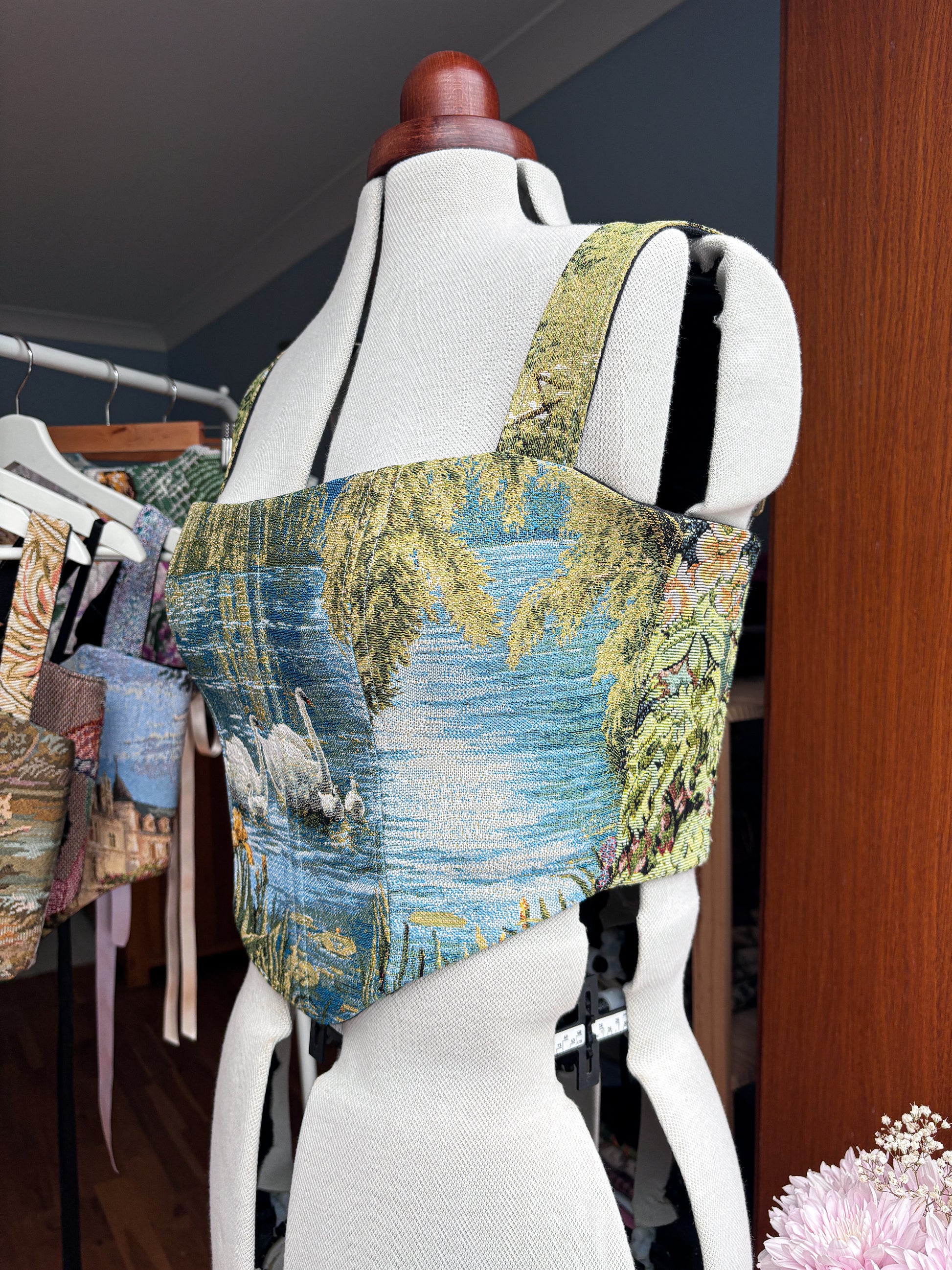 Embrace the elegance of nature with the Weeping Willow Corset. This serene scene of two swans gracefully gliding with their little cygnets, nestled beneath a sweeping willow tree. Designed with adjustable straps for added support.