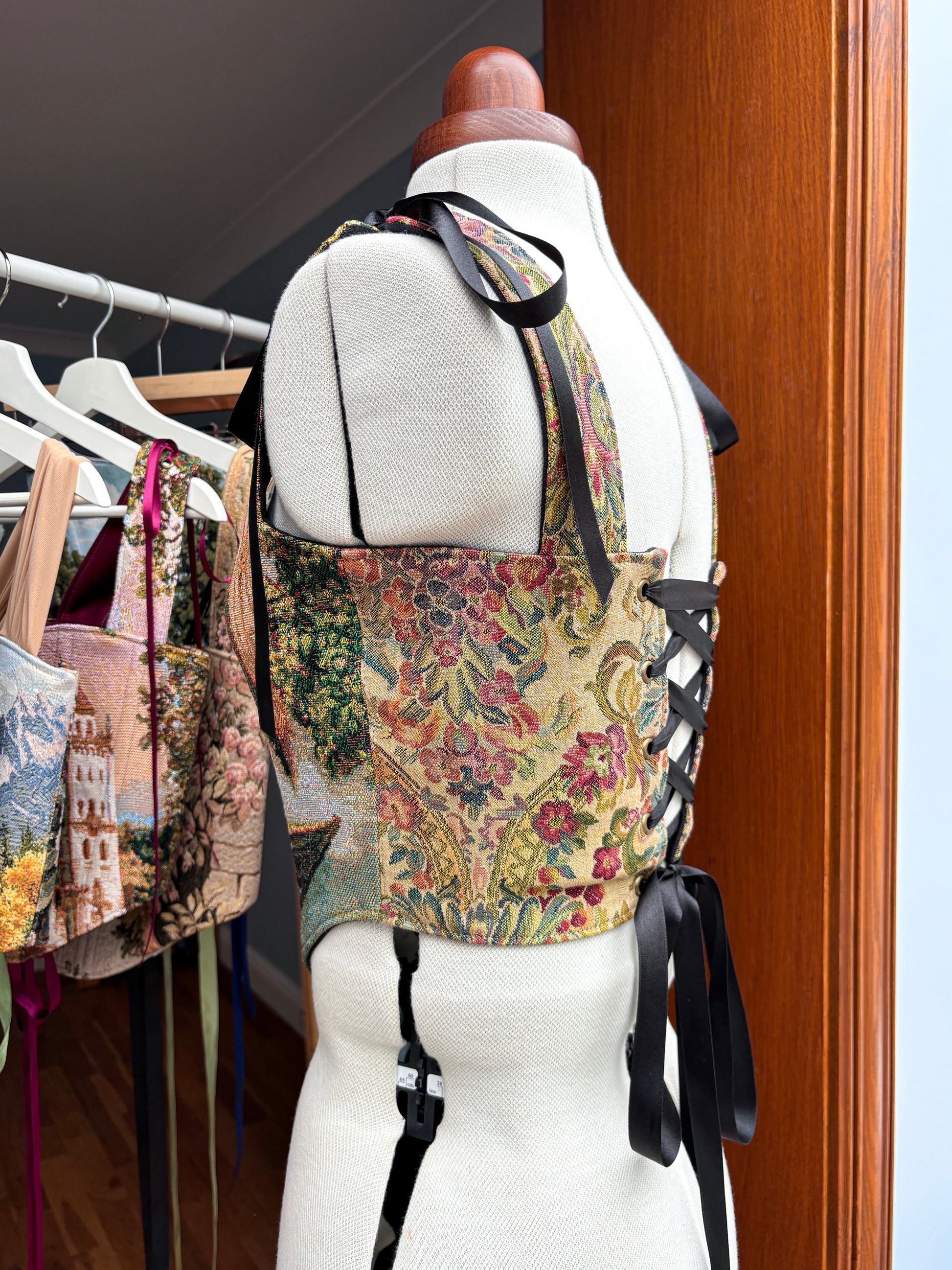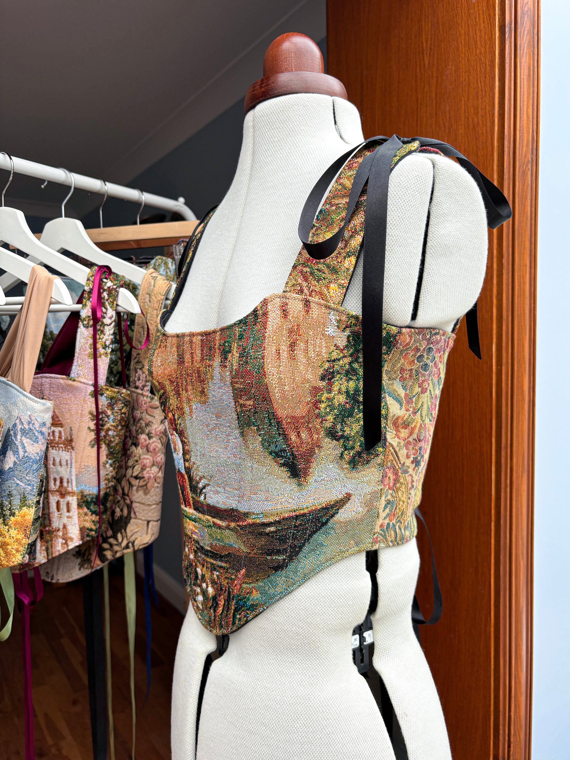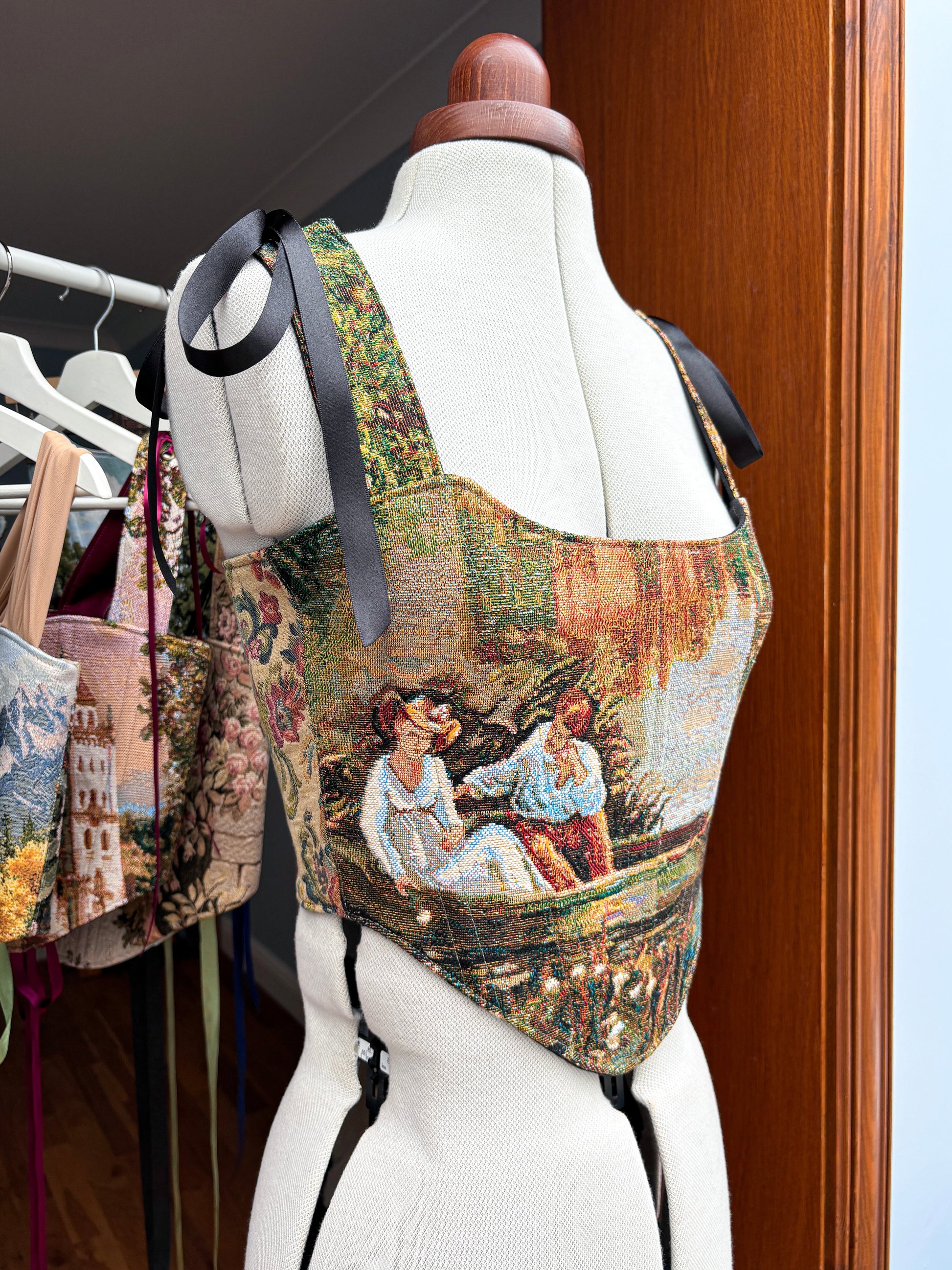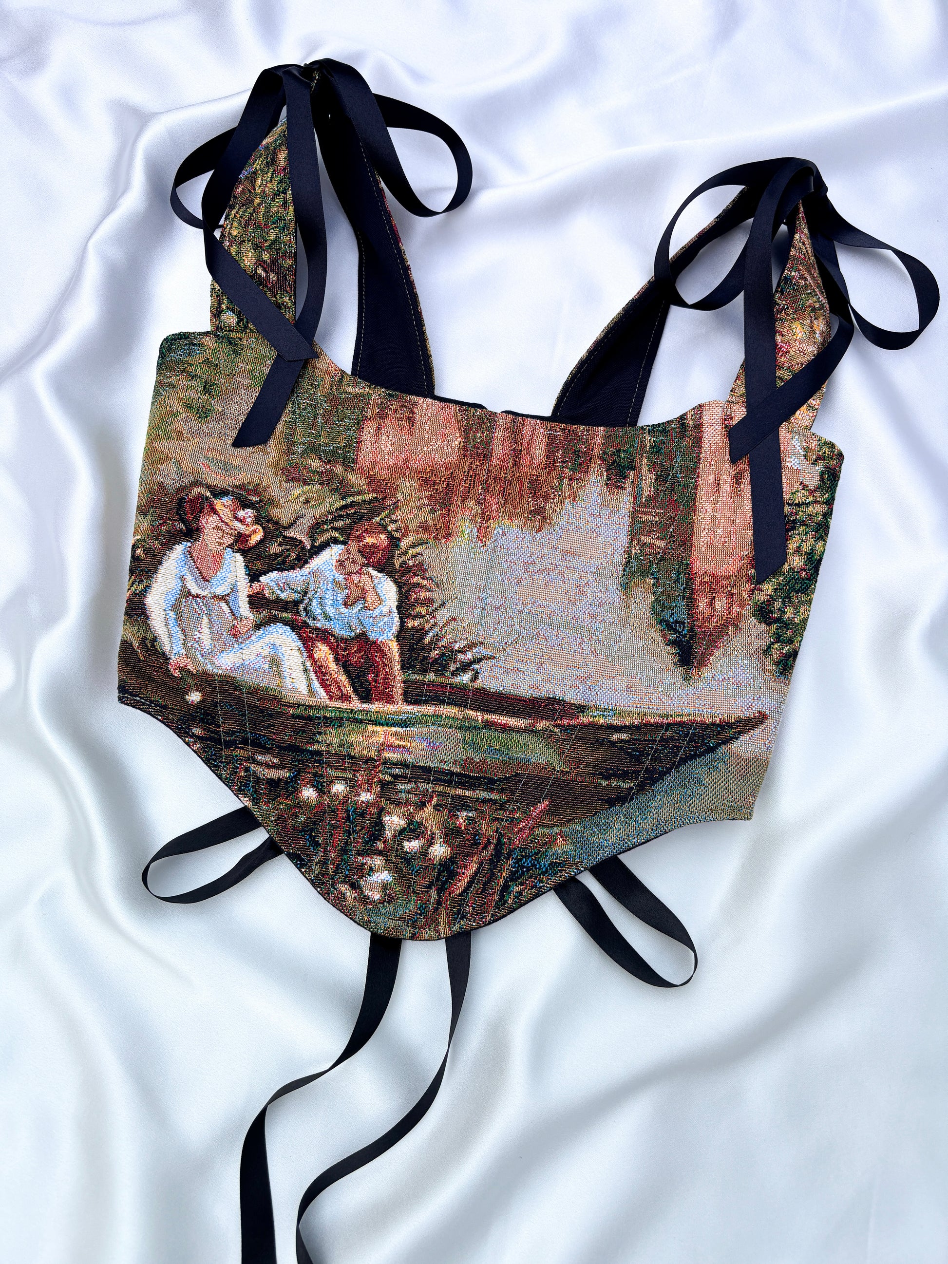 The ‘Eternal Drift’ corset captures a serene moment on a lake, with a man and woman drifting together amid warm autumnal tones. This corset’s romantic scene is complemented by a vintage floral reverse, while delicate black ribbon straps and a classic lace-up back complete the look.