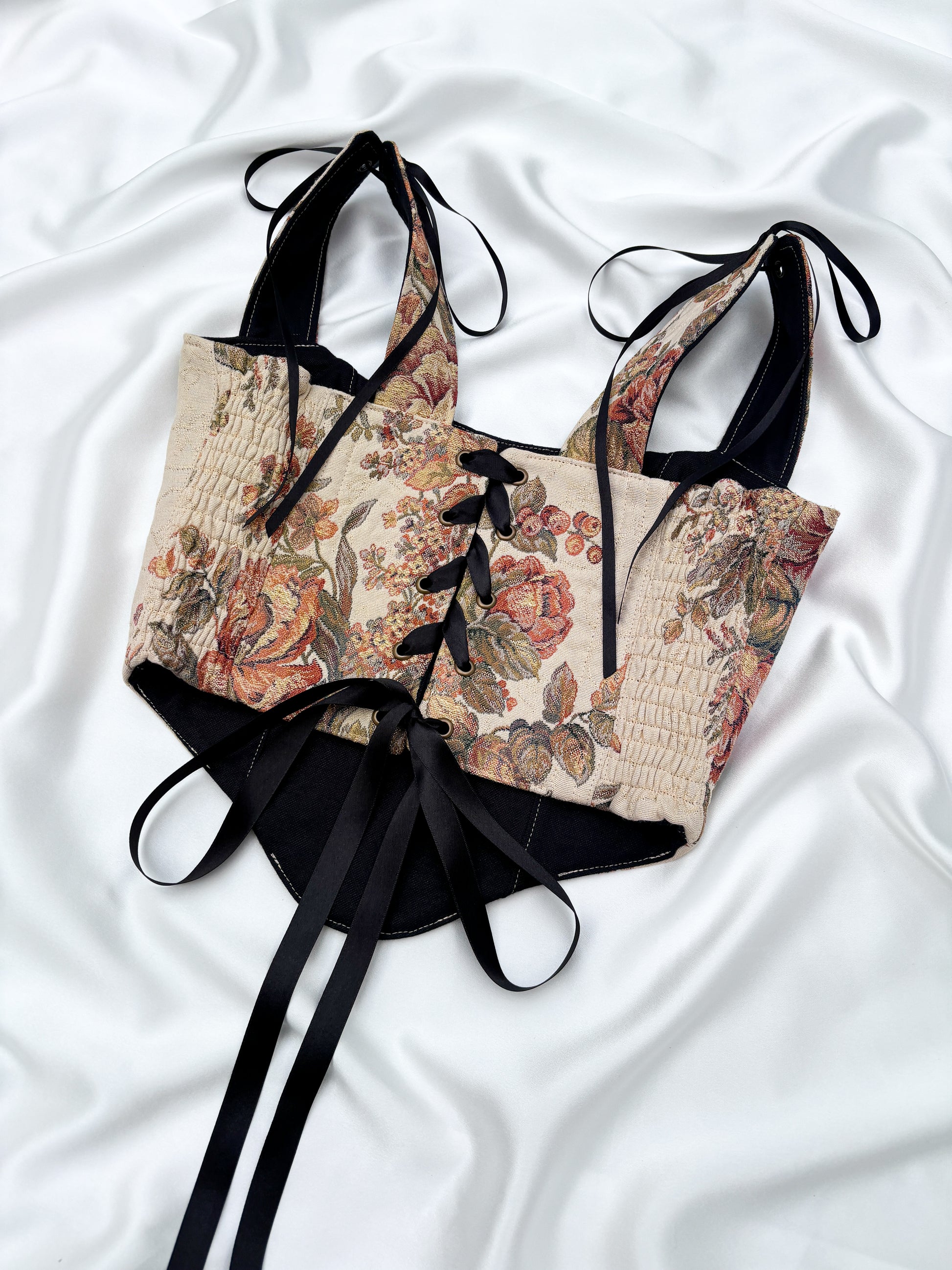 Introducing the 'Ethereal Rose' corset, featuring a warm floral design with soft tones of terracotta, gold, and sage on a neutral background. Black ribbons at the shoulders and back create a striking contrast, adding a refined finish. With its flattering structure and timeless appeal, this corset is perfect for elevating your look with a touch of vintage-inspired elegance.