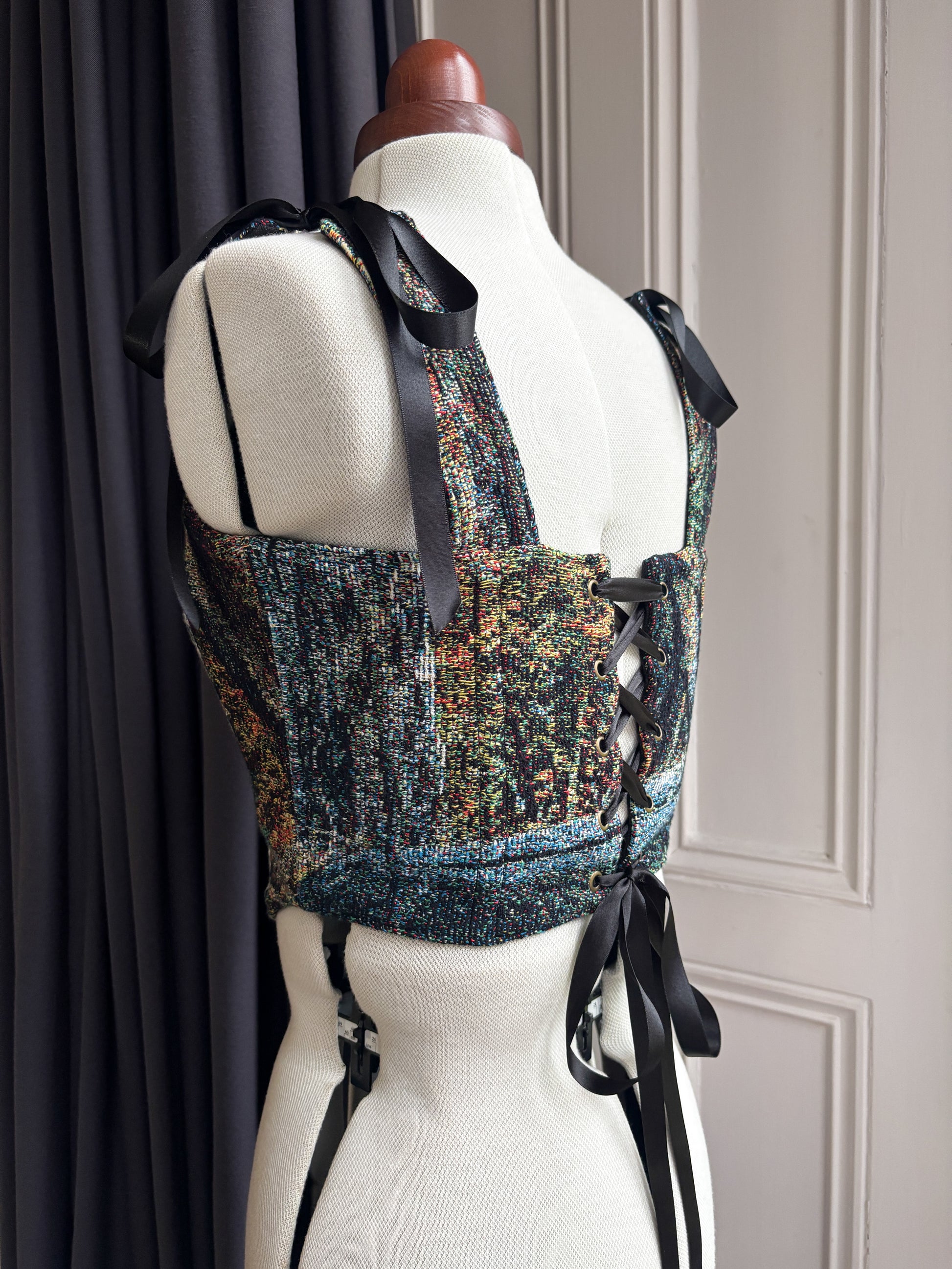 The Riverstone Corset captures the natural beauty of a flowing waterfall, enhanced by the rich earthy tones of the woodland. The bow straps are adjustable for a customisable fit, while the structured design creates a flattering shape.
