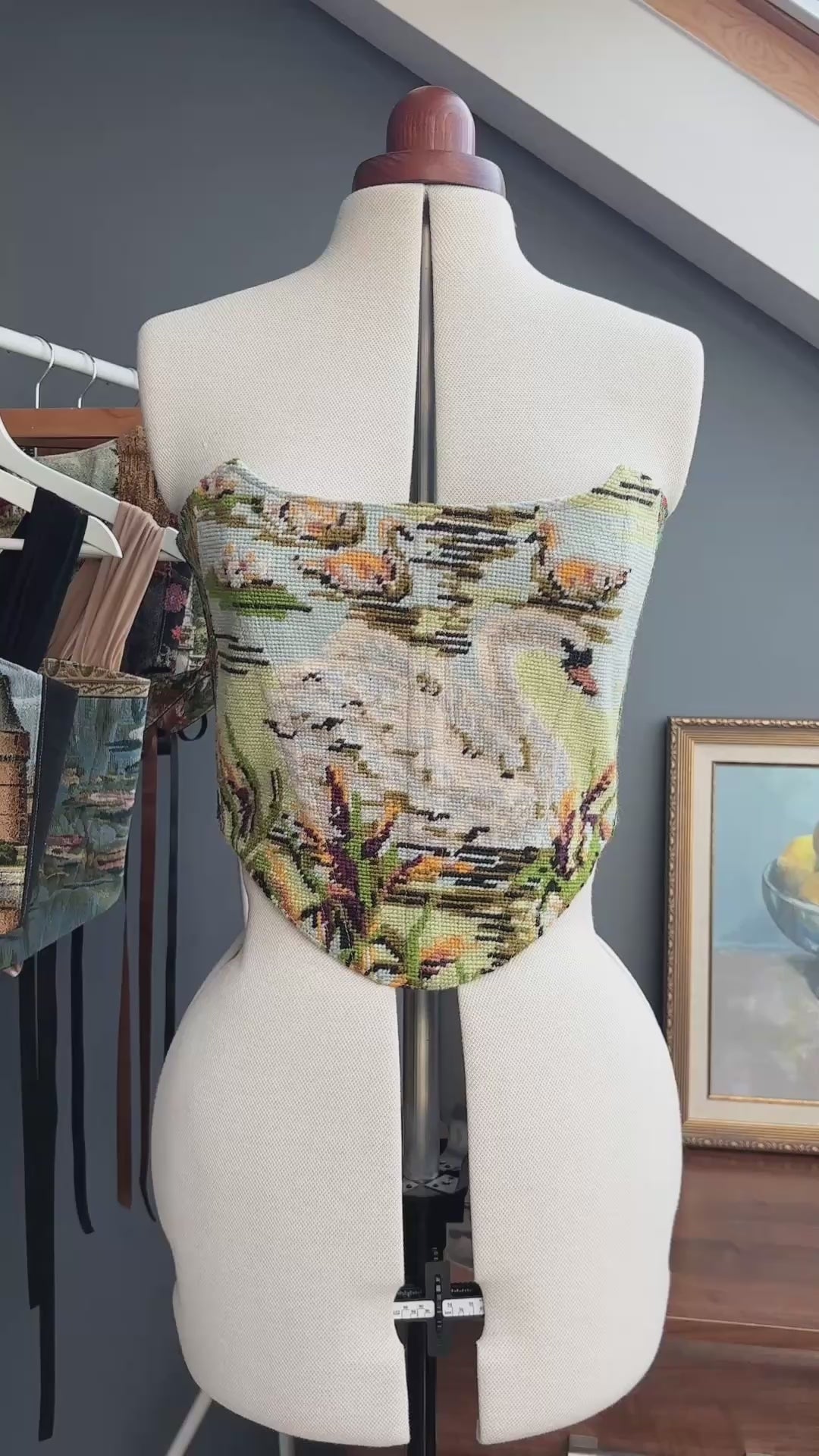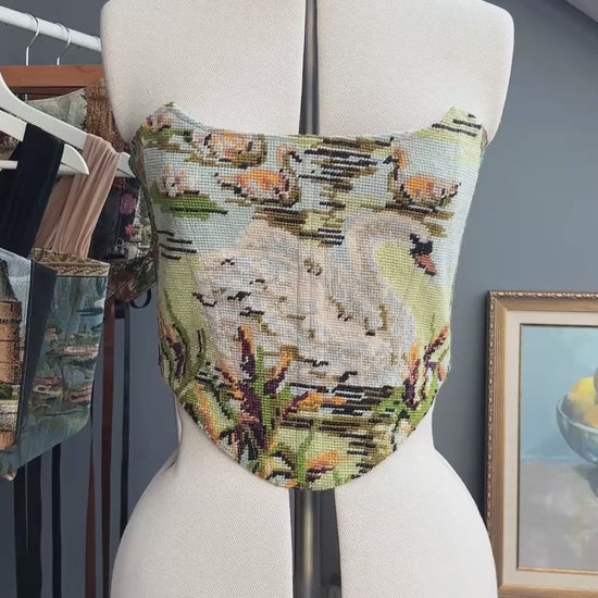 The Ivory Swan Corset captures the quiet elegance of a swan in still waters. The front features a serene white swan, framed by reeds and soft reflections, while the back continues the tranquil scene with a black swan.