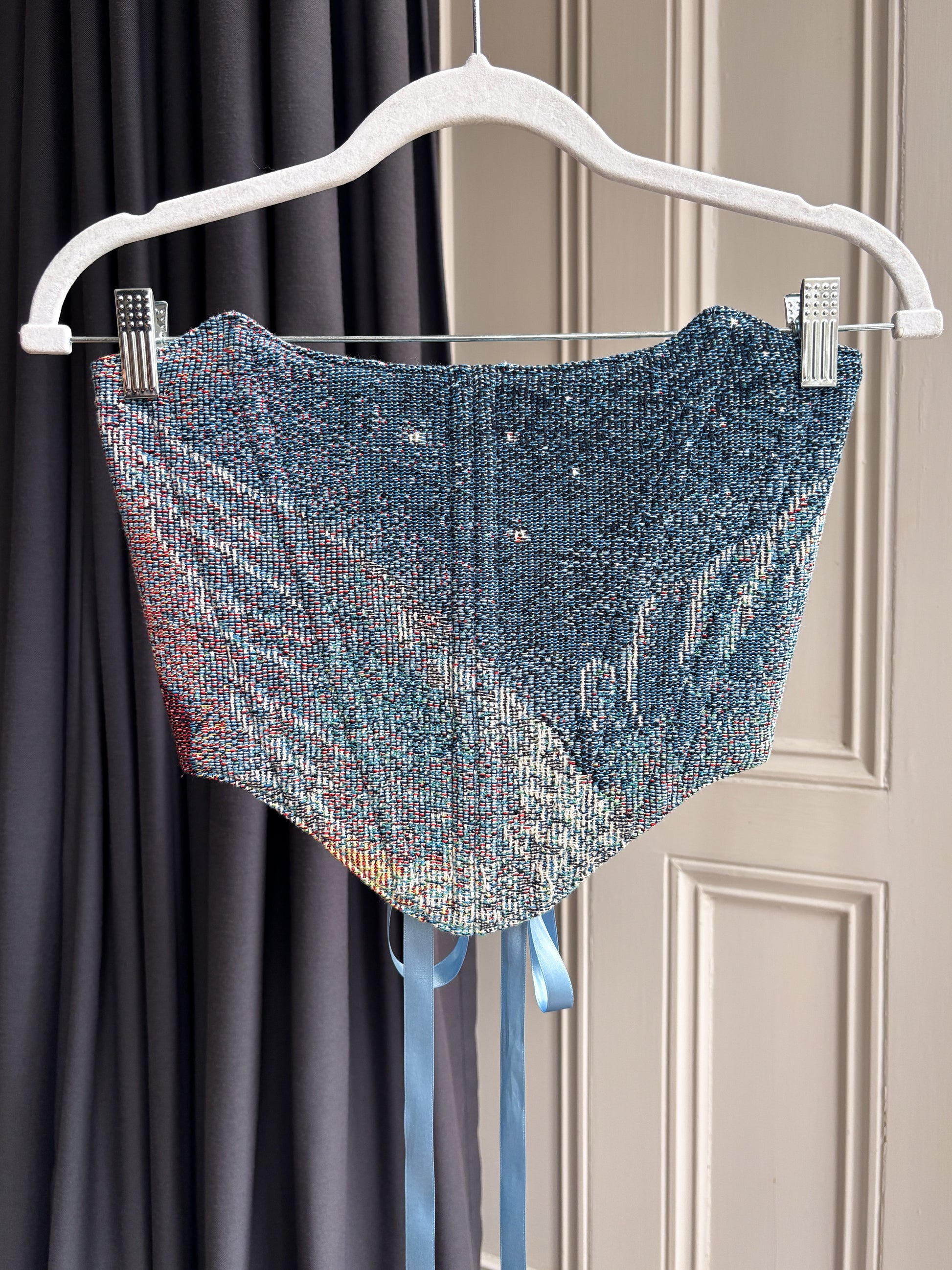 The Moonlit Wings Corset showcases delicate wing details set against a starry night design. This strapless corset offers a flattering fit with its structured design.