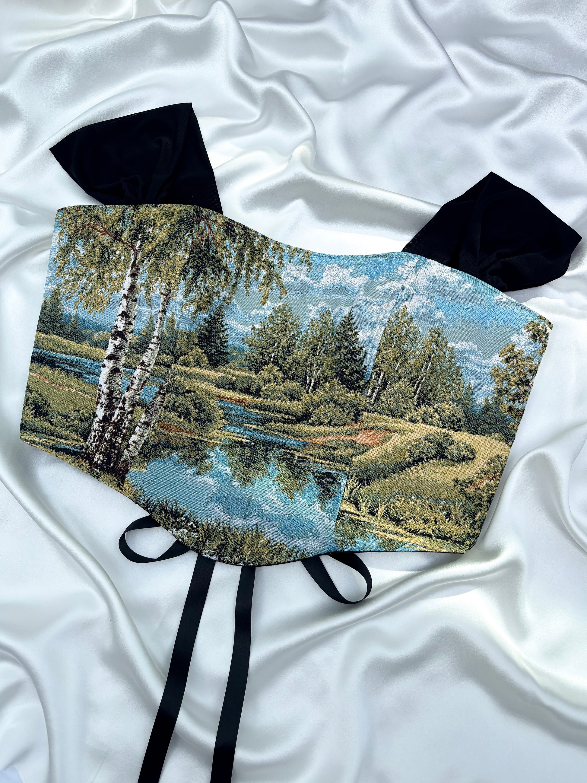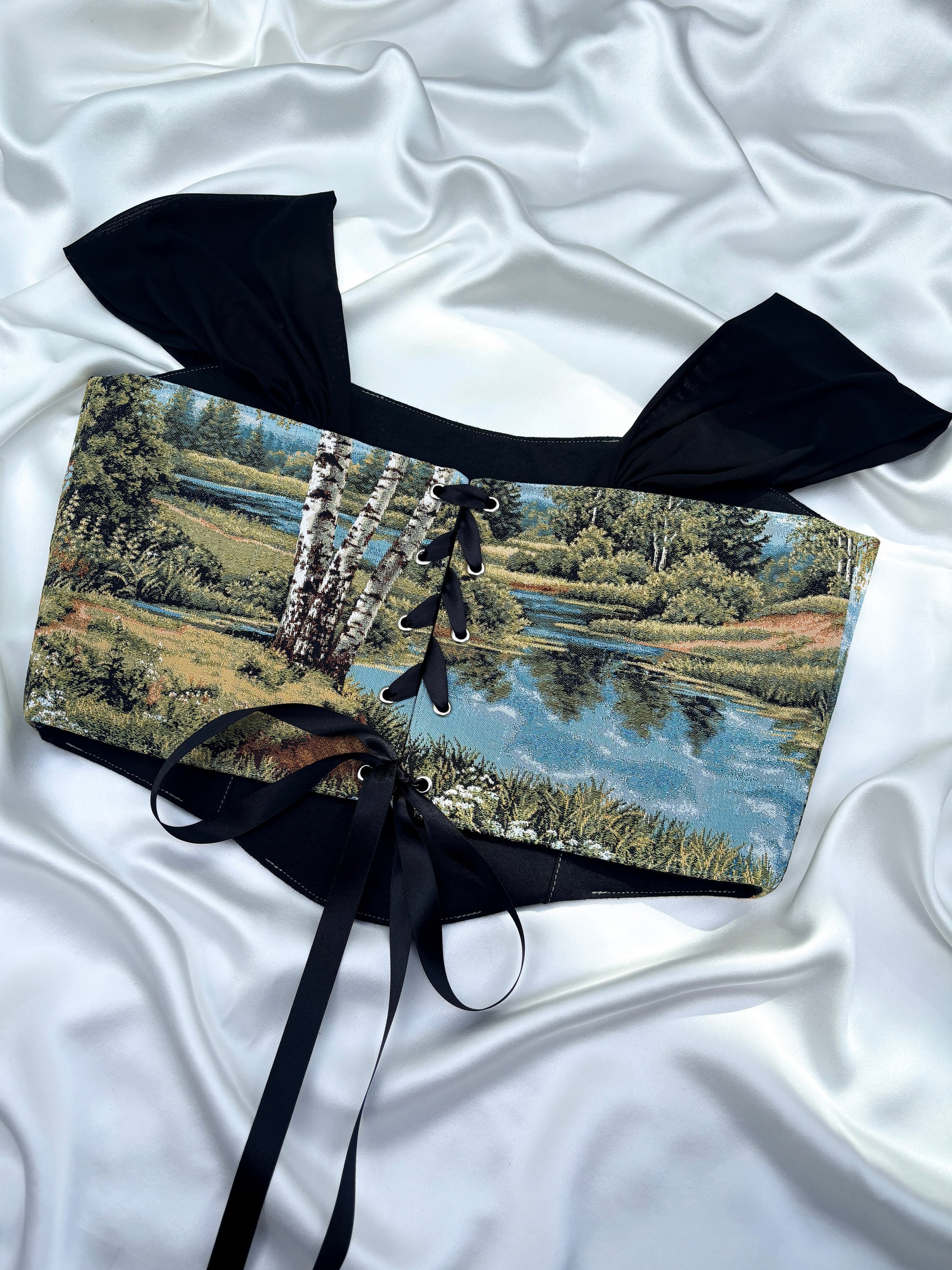 The Silver Birch corset captures the soft shimmer of a lakeside afternoon, where birch trees lean over mirrored waters. On the reverse the scenic design continues as it's finished with a sleek black ribbon and black mesh straps.