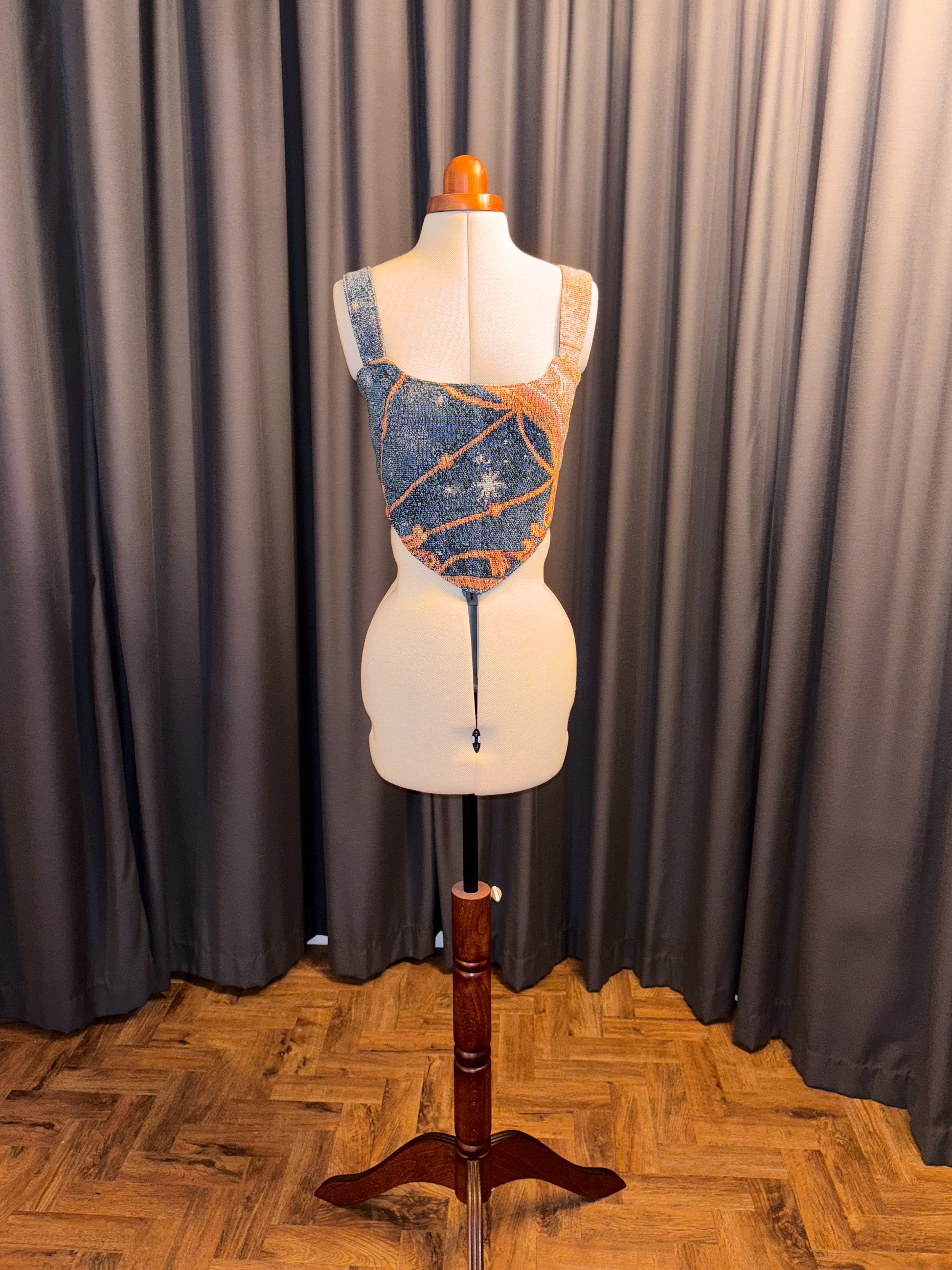 Stellar Vista Corset design evokes the feeling of looking out a window at a starry night sky. The striking stretchy material straps ane the silky lace-up ribbon finishes off the look.