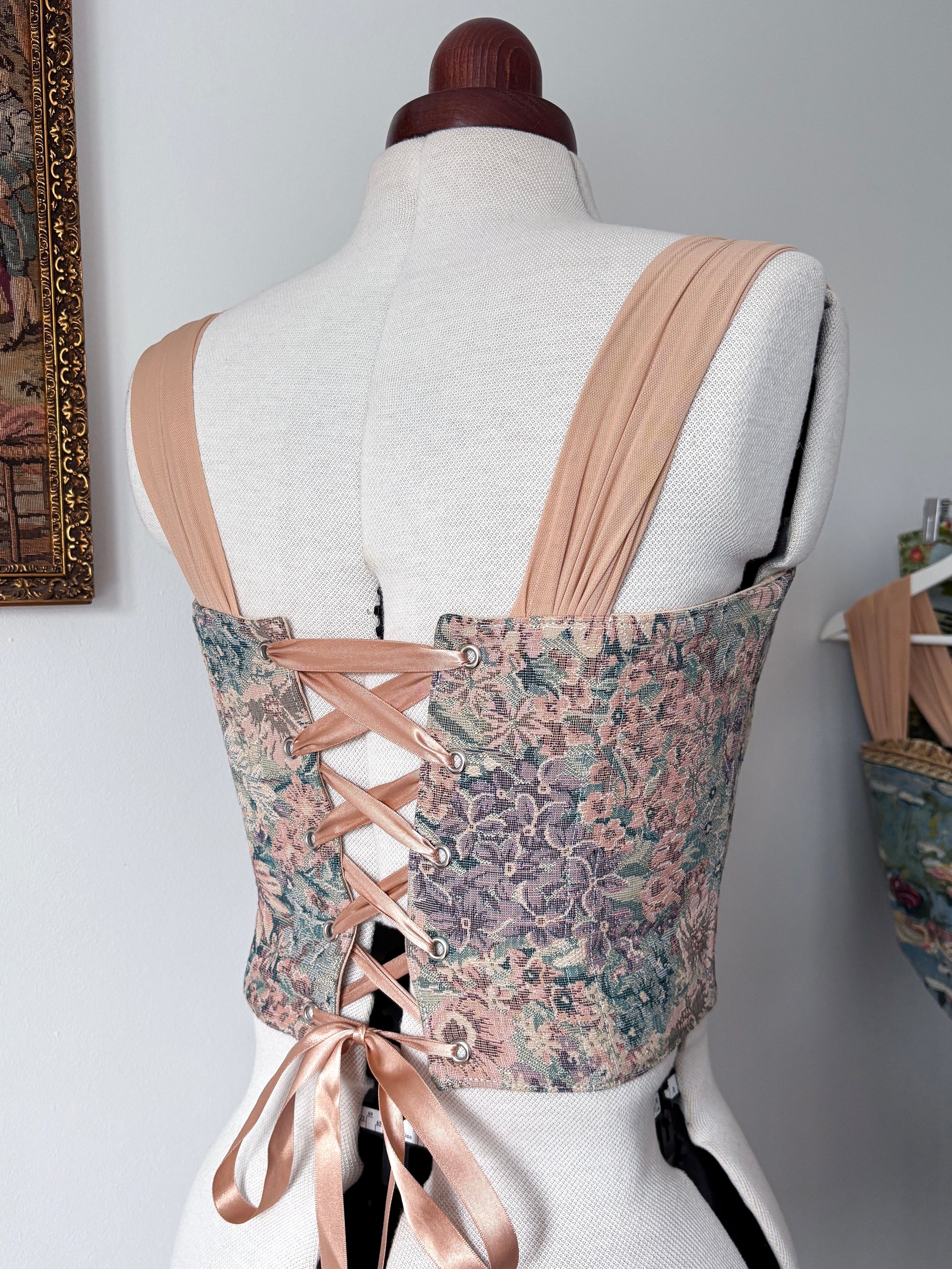 Layers of intricate vintage florals in muted colours create a rich, garden-inspired canvas for the ‘Wildflower’ corset. Finished with a sweetheart neckline, it shapes a romantic yet timeless silhouette. This corset can be tailored to your preference, available with or without straps.